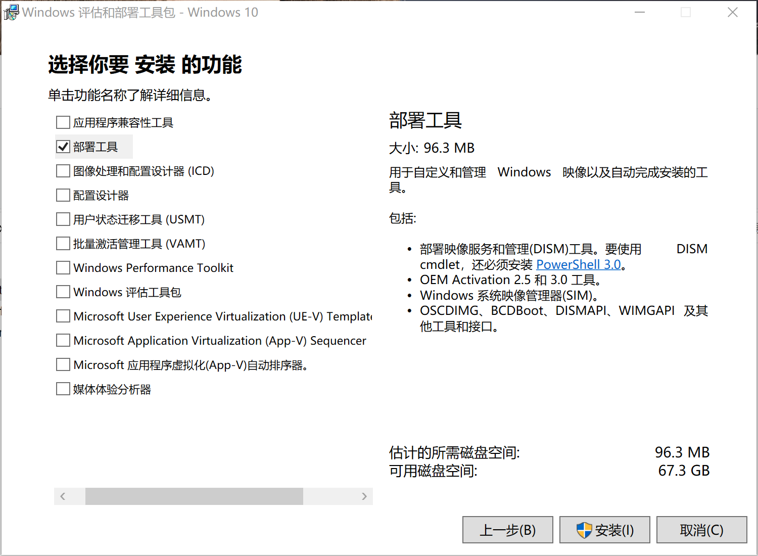 在微软官网,下载ADK和PE加载项,安装的时候一直下一步,在安装ADK的时候,只需要选择部署功能,其他都去掉。